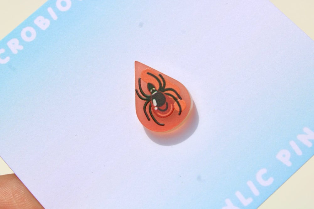 Small 1” mini frosted acrylic pin with a rubber clasp.